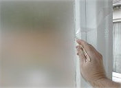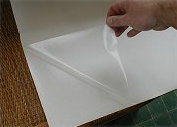 Carefully and smoothly remove the vinyl by lifting up from the glossy 'silicon release paper backing', trying to avoid finger marks and in particular, avoid creasing the film. Larger sheets may need two people to work together. One to hold the vinyl by two corners, and the other to carefully peel back the white, glossy silicon backing paper. When it's nearly all removed the second person should then take hold of the remaining two corners of the frosted-glass vinyl. It can now be taken over to the window, keeping it taut as you go, and avoiding fabrics, carpets etc., otherwise dust and fluff can be attracted to the static of the vinyl. Place it on the moistened glass and slide it into position, lining up one side to the window frame.