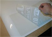 Carefully remove the vinyl graphics by lifting up the 'application tape' from the 'silicon release paper backing', (making sure that all the vinyl decals are lifted up with it), avoiding finger marks on the vinyl itself. Larger sheets may need two people to work together. One to hold the application tape/graphics by two corners, and the other to carefully peel back the white, glossy silicon backing paper. When it's nearly all removed the second person should then take hold of the remaining two corners of the tape/graphics. It can now be taken over to the vehicle, keeping it taut as you go, and avoiding fabrics, clothing etc., otherwise dust and fluff can be attracted to the static of the vinyl.